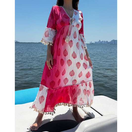 Boho Floral Pom Pom Dress with Gold and Rope Accents