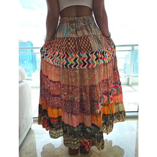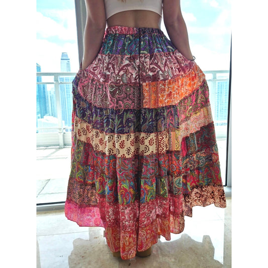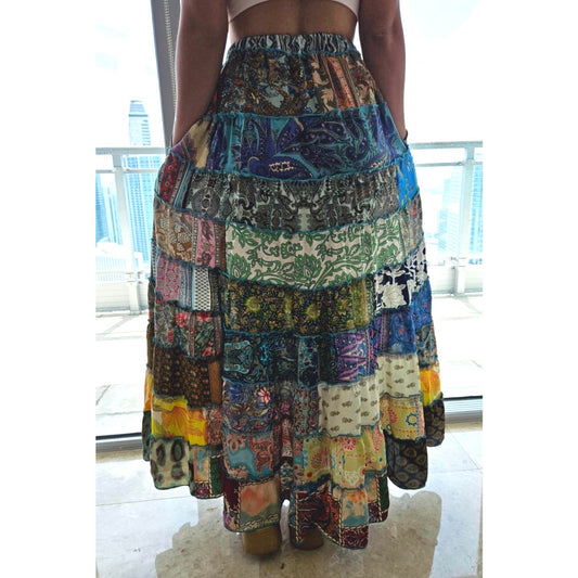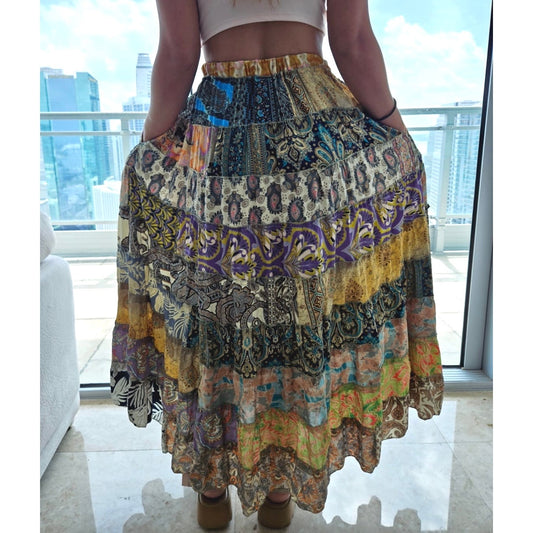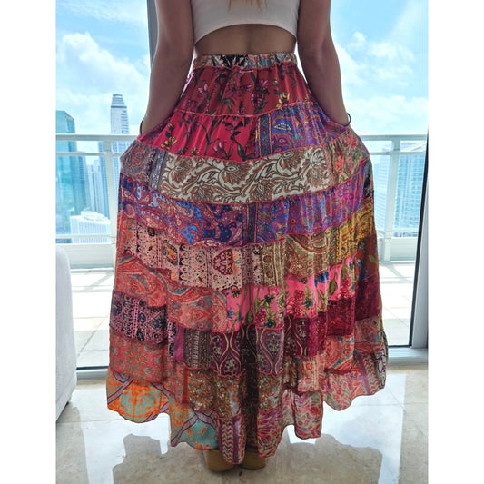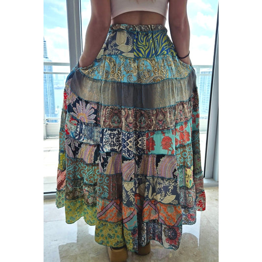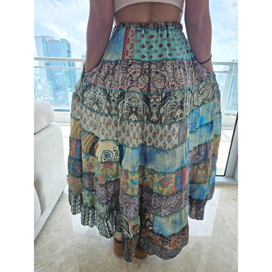 Mixed-Patchwork maxi skirt with pockets- One Size 100% Silk