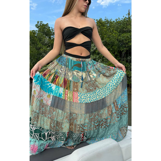 Mixed-Patchwork maxi skirt with pockets- One Size 100% silk