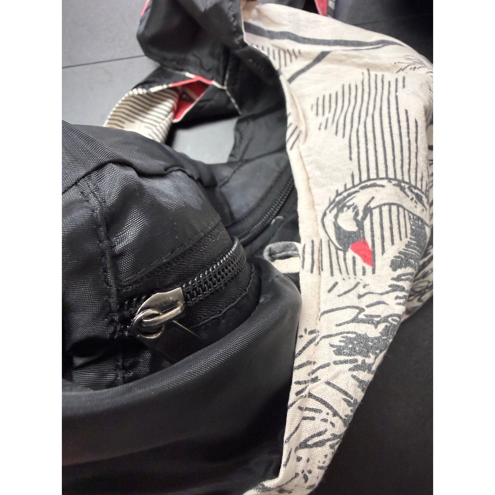 Closes with a button and inside is secured with a zipper. The bag has plenty of interior space and a side pocket to stash your keys and phone
