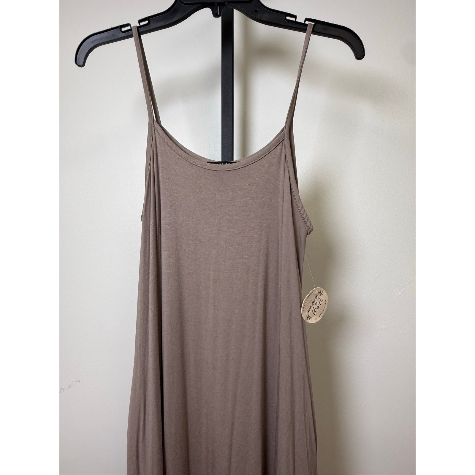 Beautiful and effortless taupe maxi dress featuring a relaxed A-line silhouette with a soft drape and asymmetrical hem. Lightweight and breathable fabric that moves beautifully and feels ultra comfortable. Spaghetti straps and a scoop neckline give it a flattering, feminine fit. Perfect for summer, vacations, weekend outings, brunch, or beach days.