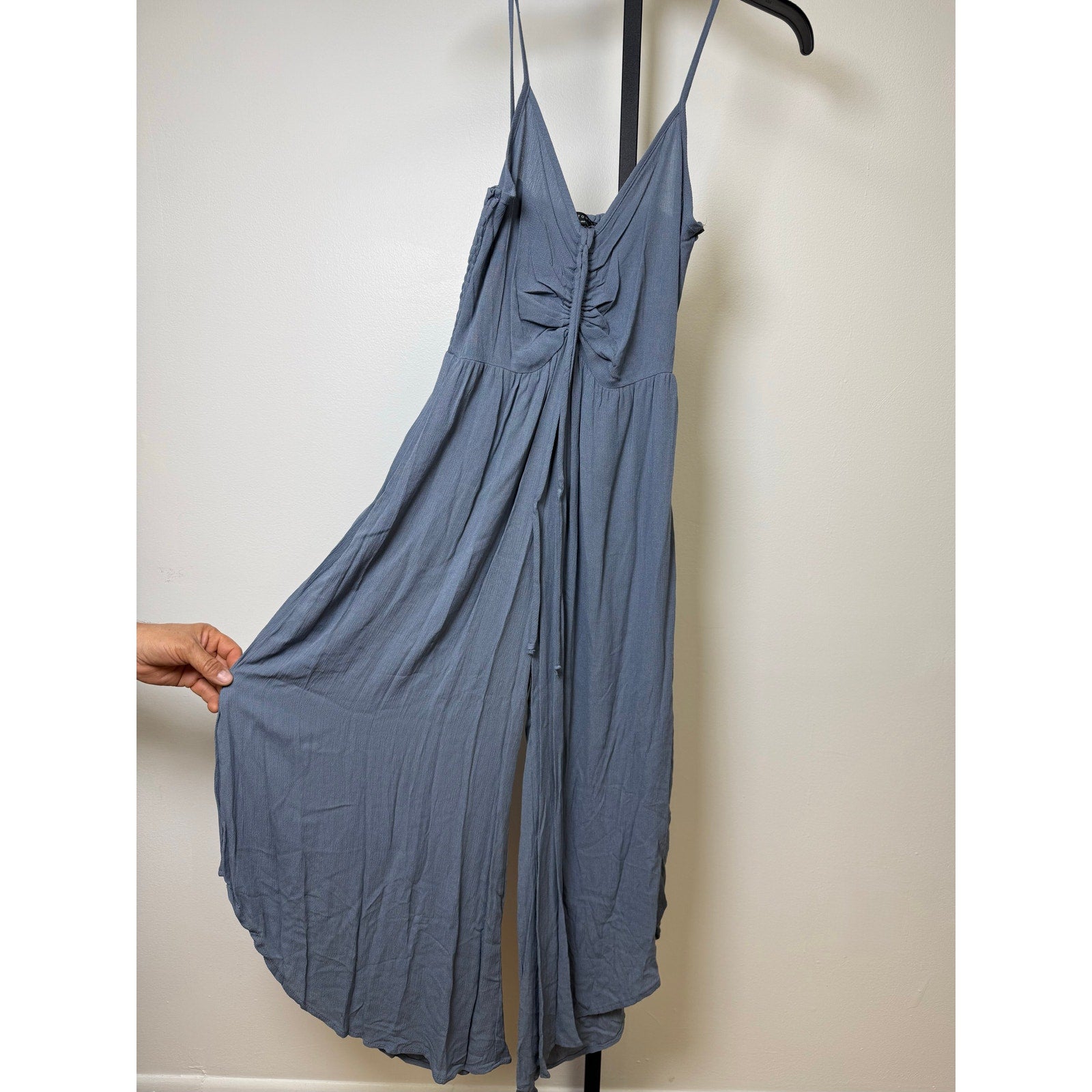 WOVEN SOLID FRONT RUCHED ROUND HEMMING MIDI JUMPSUIT. 100% RAYON GAUZE